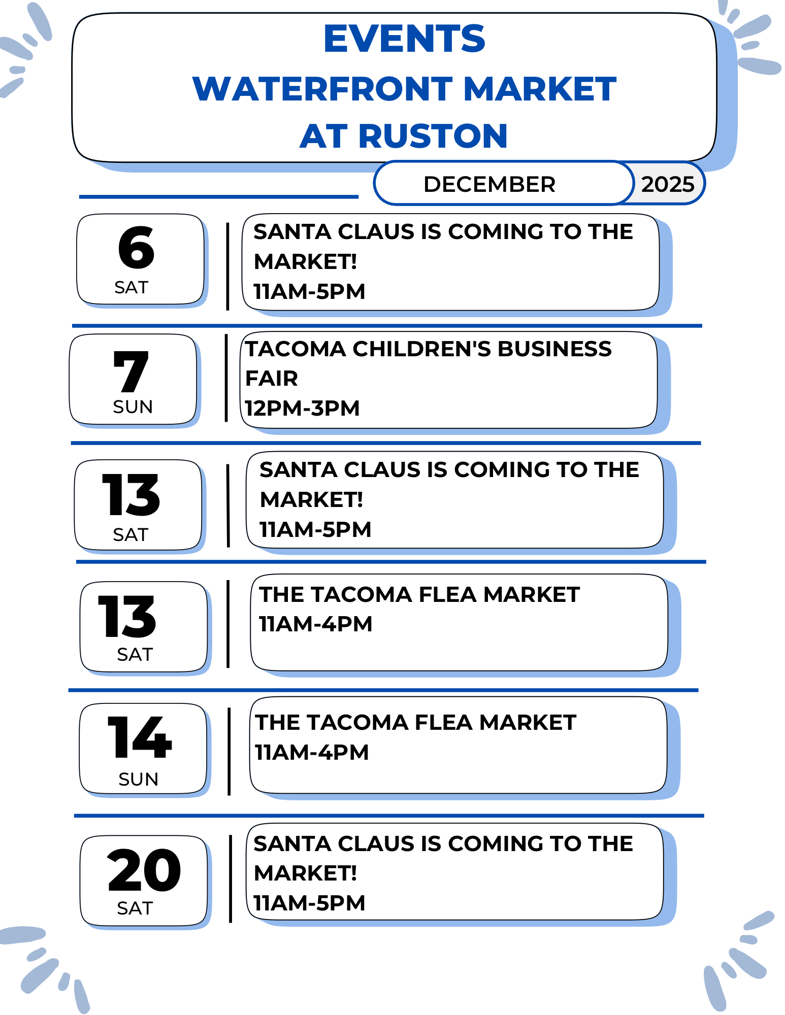 At Waterfront Market at Ruston, we love bringing the community together through fun, engaging, and unique events all year round! Our events showcase a diverse mix of local vendors, delicious food, live entertainment, and exciting activities for all ages. Whether you’re looking for handmade crafts, specialty foods, or a place to connect with friends and family, our events offer something for everyone.