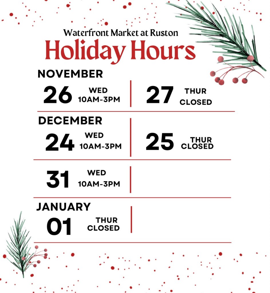 Nestled along the scenic waterfront, the Waterfront Market at Ruston is more than just a marketplace—it’s a destination. Our indoor, year-round market brings together a diverse collection of local artisans, specialty vendors, and small businesses, creating a one-of-a-kind shopping experience for the community and visitors alike. Open 7 days a week 10am – 6pm individual businesses hours may vary.